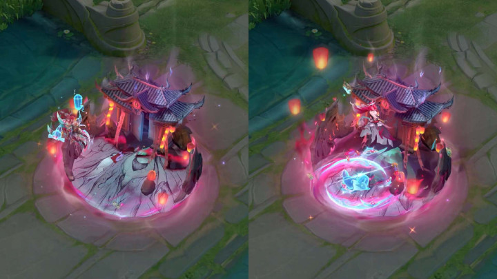 然后就是这个回城特效了,这个回城特效是实体特效,我感觉挺不错的。释放之后,这个面积挺大,会出现一栋小房子,给人一种挺霸气的感觉,而且还有一些小元素,比如说那个红灯笼。