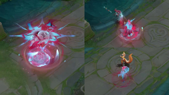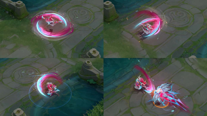 整体来看的话,也没什么太特别的。因为在官方的介绍里面,说要辅以火焰、灰烬等元素,但是这个效果我感觉有没有彰显出那种熊熊烈火的感觉,也没有那种幽灵火的视觉感,所以感觉一技能的这个特效并没有彰显出太高级的感觉。不过中间的刀刃划过莲花的时候,那种视觉感还行。