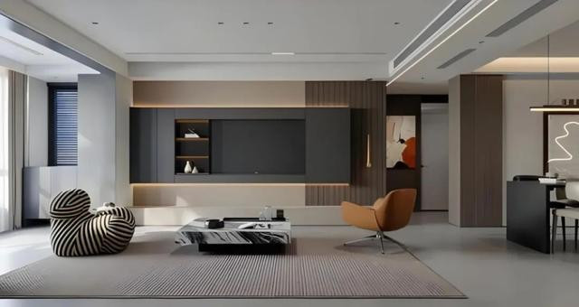 客厅设计非常现代和时尚,整体风格简约而富有质感。电视背景墙采用了悬浮设计,内嵌的电视机和开放式的展示架,既增加了储物功能,又使空间显得更加整洁有序。背景墙上的木质装饰板,增加了空间的质感和温馨。