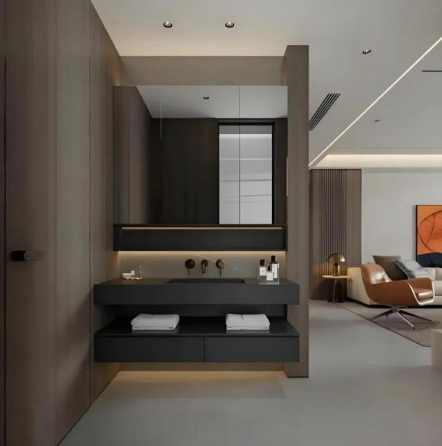 卫生间干区与休息区相连,设计上没有明显的隔断,使得整个空间显得更加开阔和通透。大镜子增加了空间感,同时镜柜可能也提供了额外的储物空间,方便日常洗漱和整理。