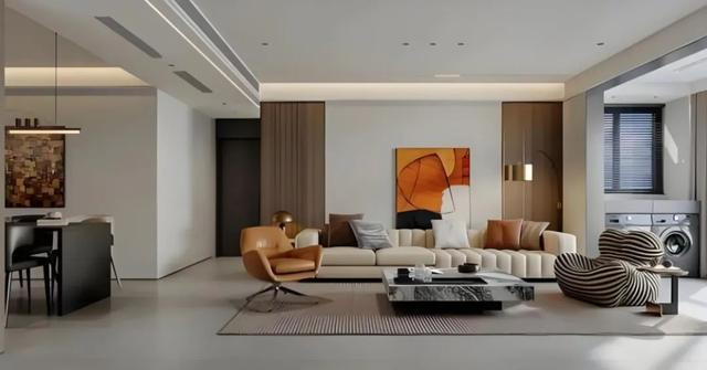 客厅整体设计简洁而时尚。浅色的布艺沙发,表面有垂直的褶皱设计,增添了一些立体感和层次感。搭配亮色皮质单椅,使得整体色调既柔和又充满活力。