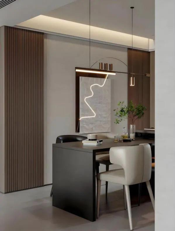 餐厅的吊灯设计独特,吊顶暗藏灯带,配上时尚感的吊灯,增添了现代感和艺术感。灯光柔和,营造出温馨的用餐氛围。