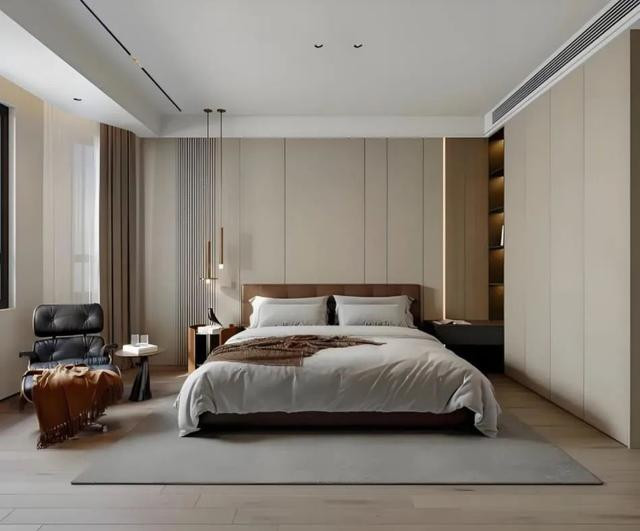 主卧床头背景墙采用了浅棕色的面板贴面,背景墙的设计简洁,线条干净利落,没有多余的装饰,营造出温馨宁静的氛围。