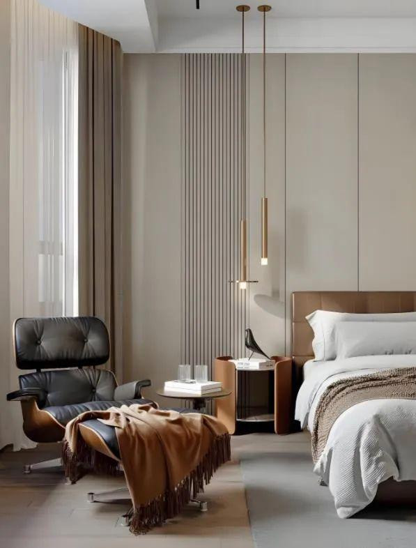在房间左侧靠近窗户的位置,有一把黑色皮质休闲椅及其配套的脚凳。配上简约小茶几,充当一个休闲区。床头的上方安装有两个细长的吊灯,设计简约现代,提供局部照明。